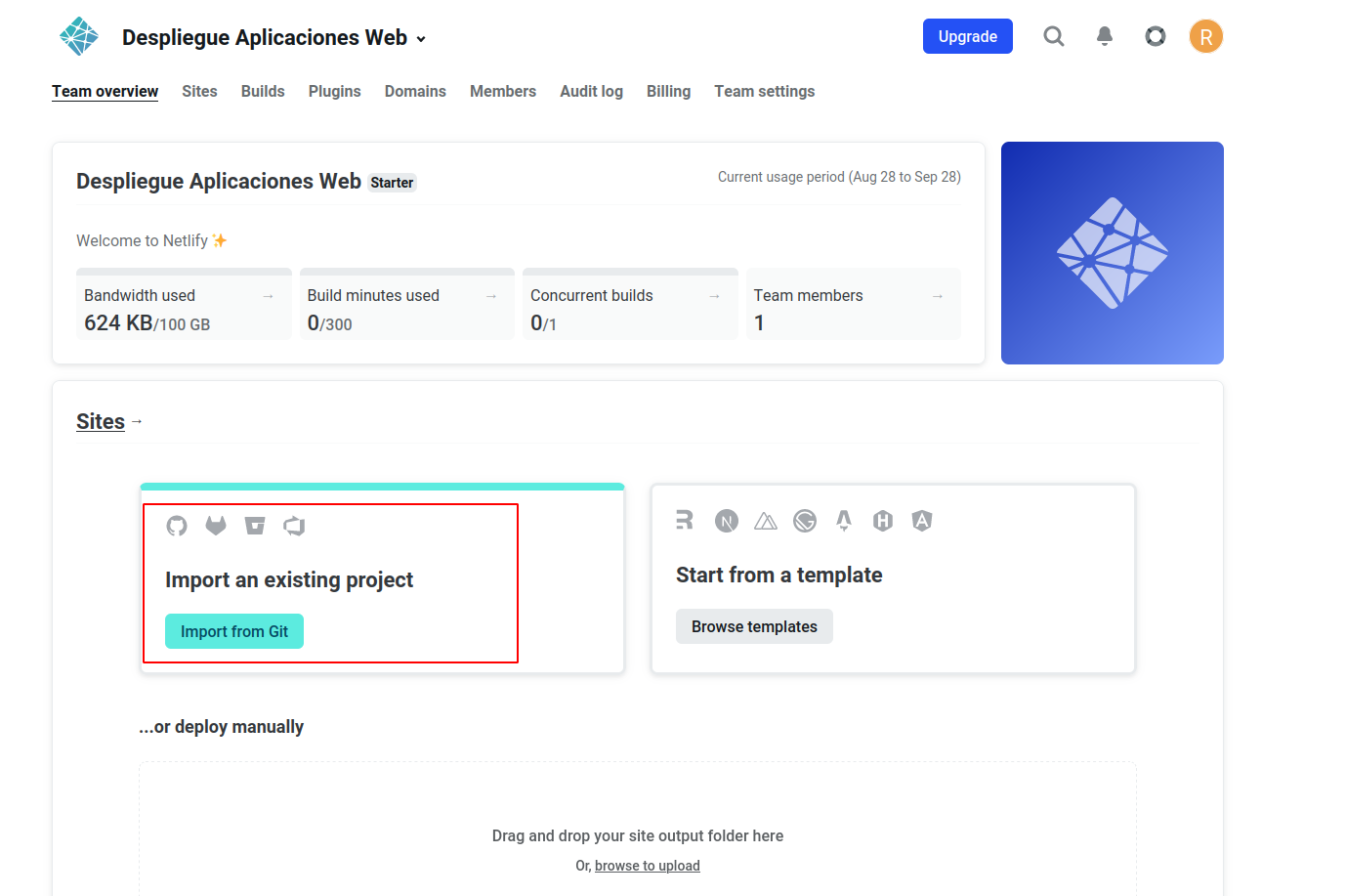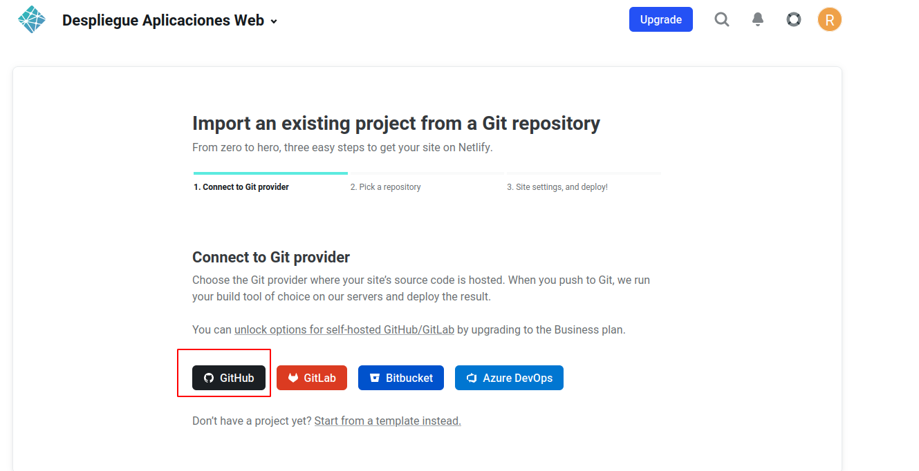 Ahora que ya tenemos subido el código a GitHub, de alguna manera debemos enganchar o enlazar nuestra cuenta de Github con la de Netlify para que éste último pueda traerse el código de allí, hacer el build y desplegarlo. Así pues, entramos en nuestro dashboard de Netlify y le damos a importar proyecto existente de git: