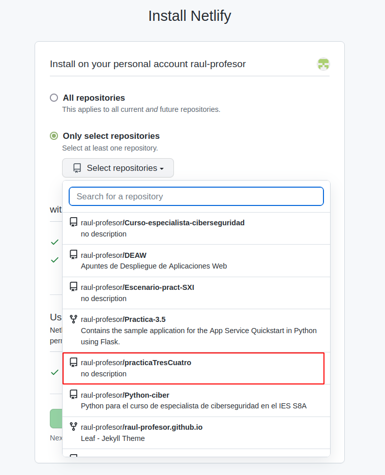 Y luego le indicaremos que no acceda a todos nuestros repositorios sino sólo al repositorio que necesitamos, que es donde tenemos el código de nuestra aplicación: