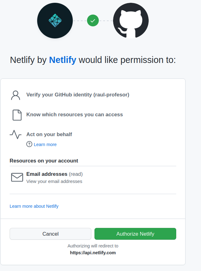 Y nos saltará una ventana pidiendo que autoricemos a Netlify a acceder a nuestros repositorios de Github: