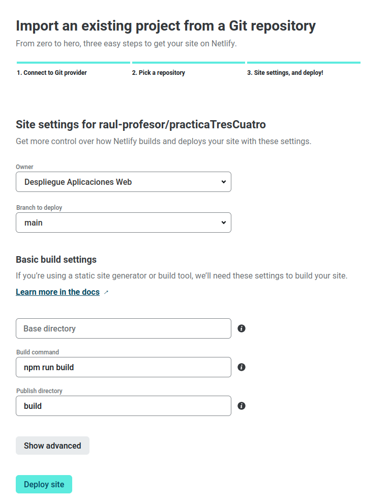 Tras el deploy, en "Site settings" podeís y debéis cambiar el nombre de la aplicación por nombre-practica3-4, donde nombre es vuestro nombre.