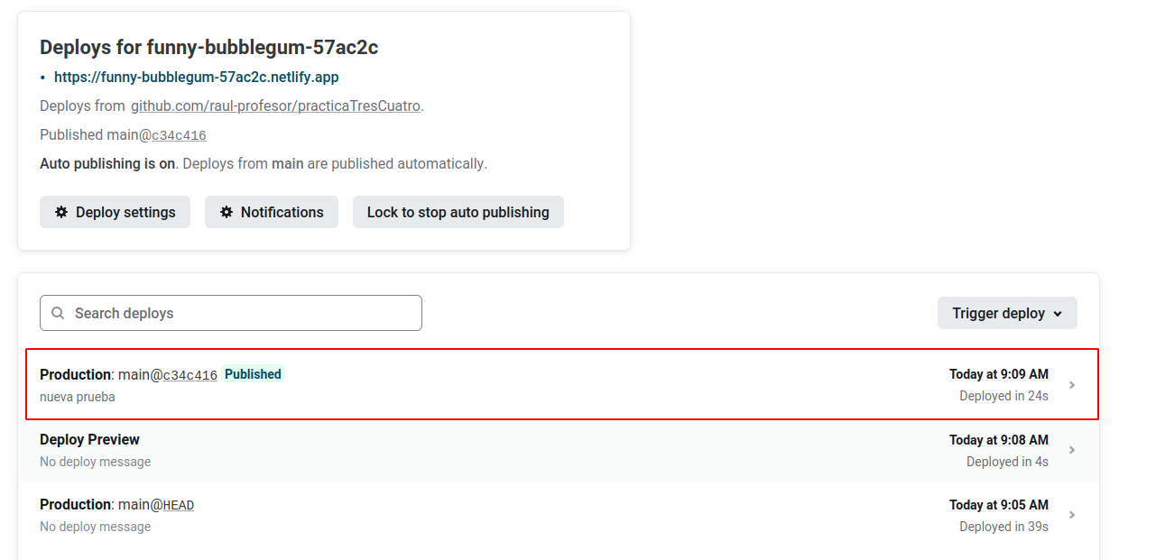 Comprueba en el dashboard de Netlify que se ha producido un nuevo deploy de la aplicación hace escasos segundos